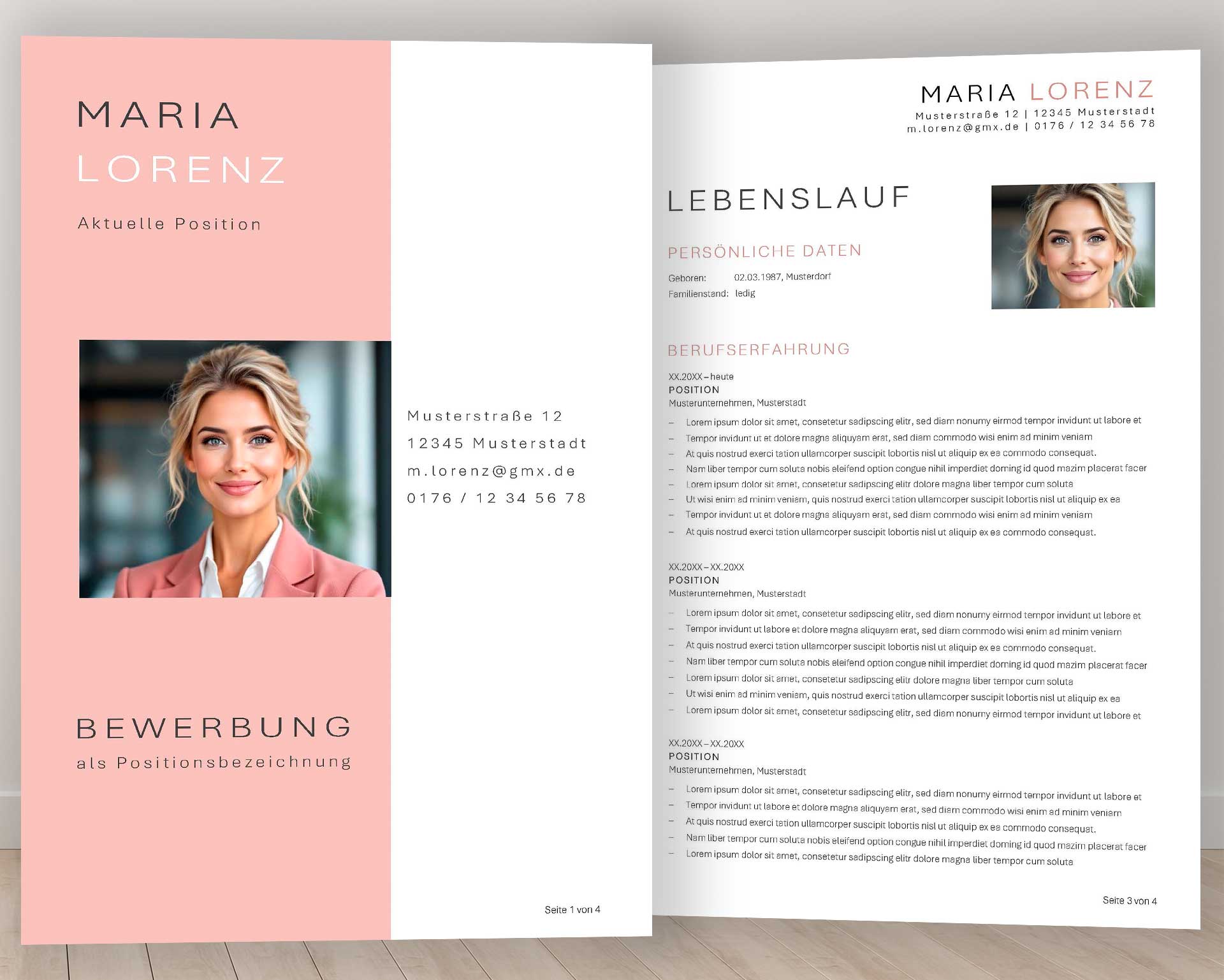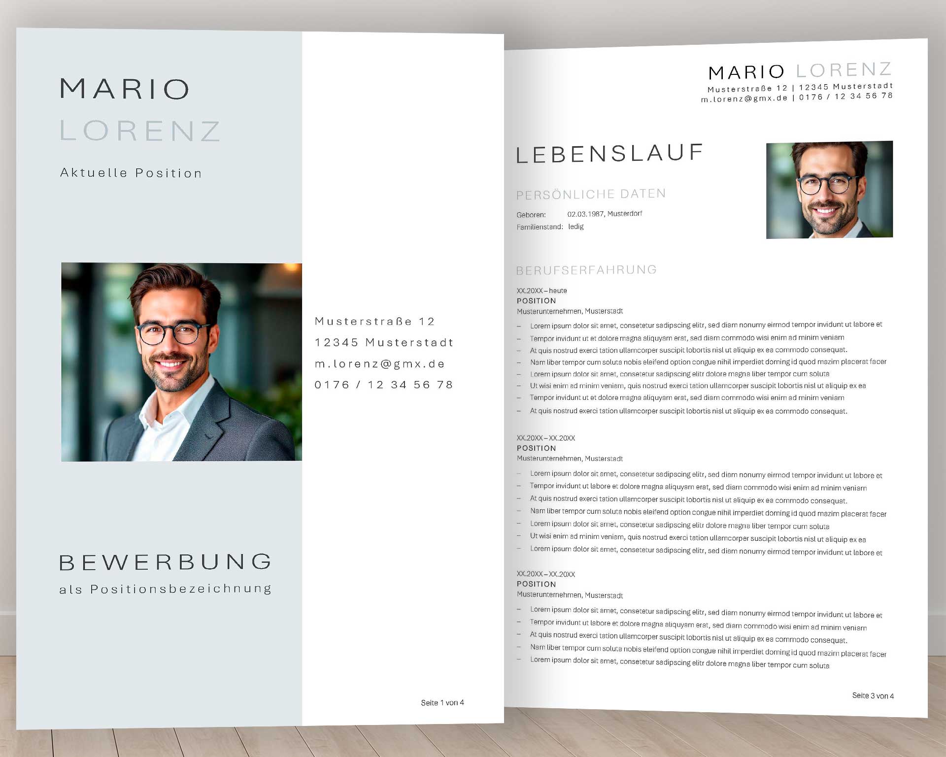 Die markante, vertikale Farbfläche lenkt den Blick sofort auf das Wesentliche: dein Bewerbungsfoto und deine wichtigsten Informationen. Der großzügige Weißraum rundherum schafft Luft und Orientierung – wie ein aufgeräumter Schreibtisch, auf dem nichts vom Ziel ablenkt. Die Typografie bleibt zurückhaltend, aber wirkungsvoll – jeder Buchstabe steht für Präzision, jede Linie für Konzentration.