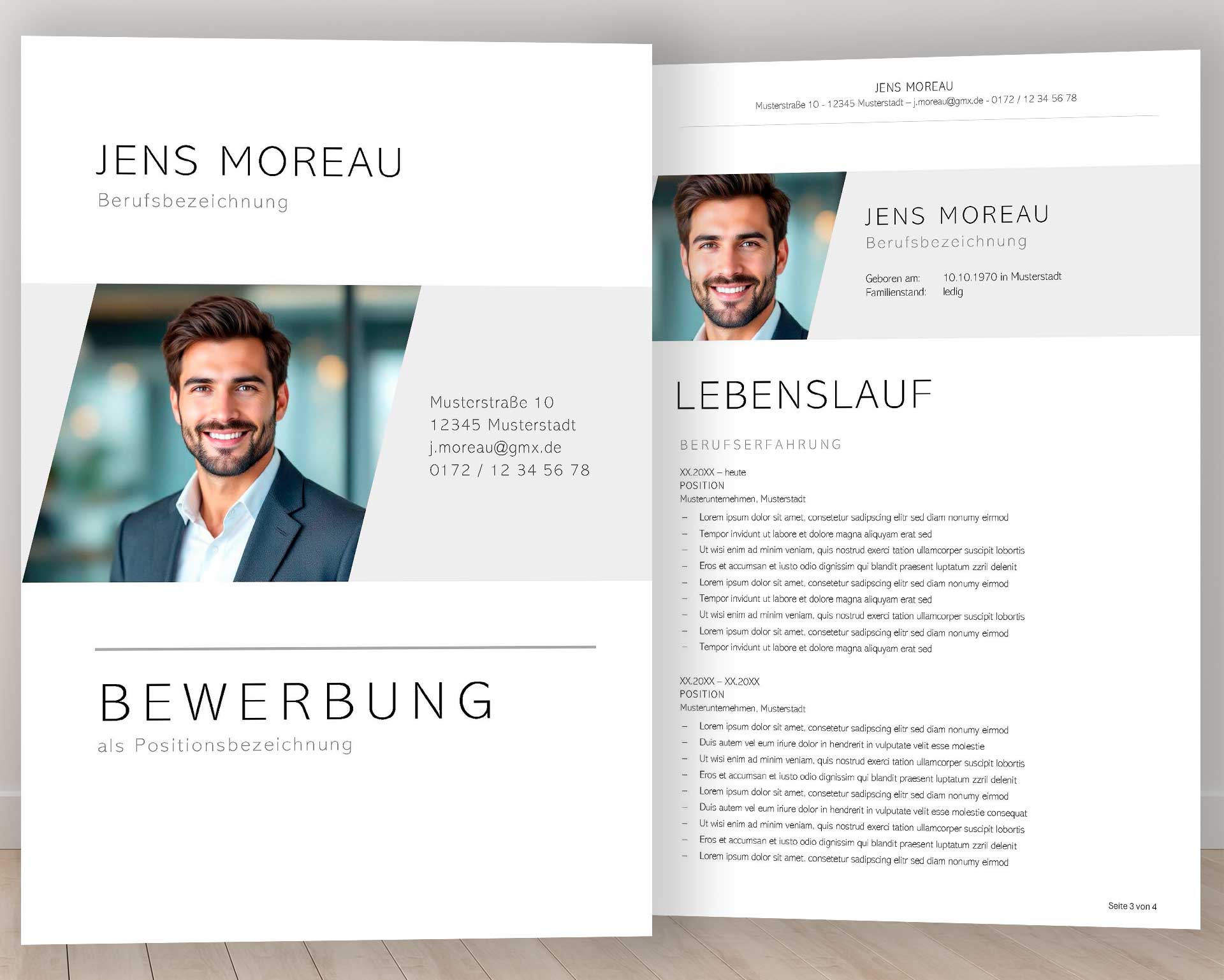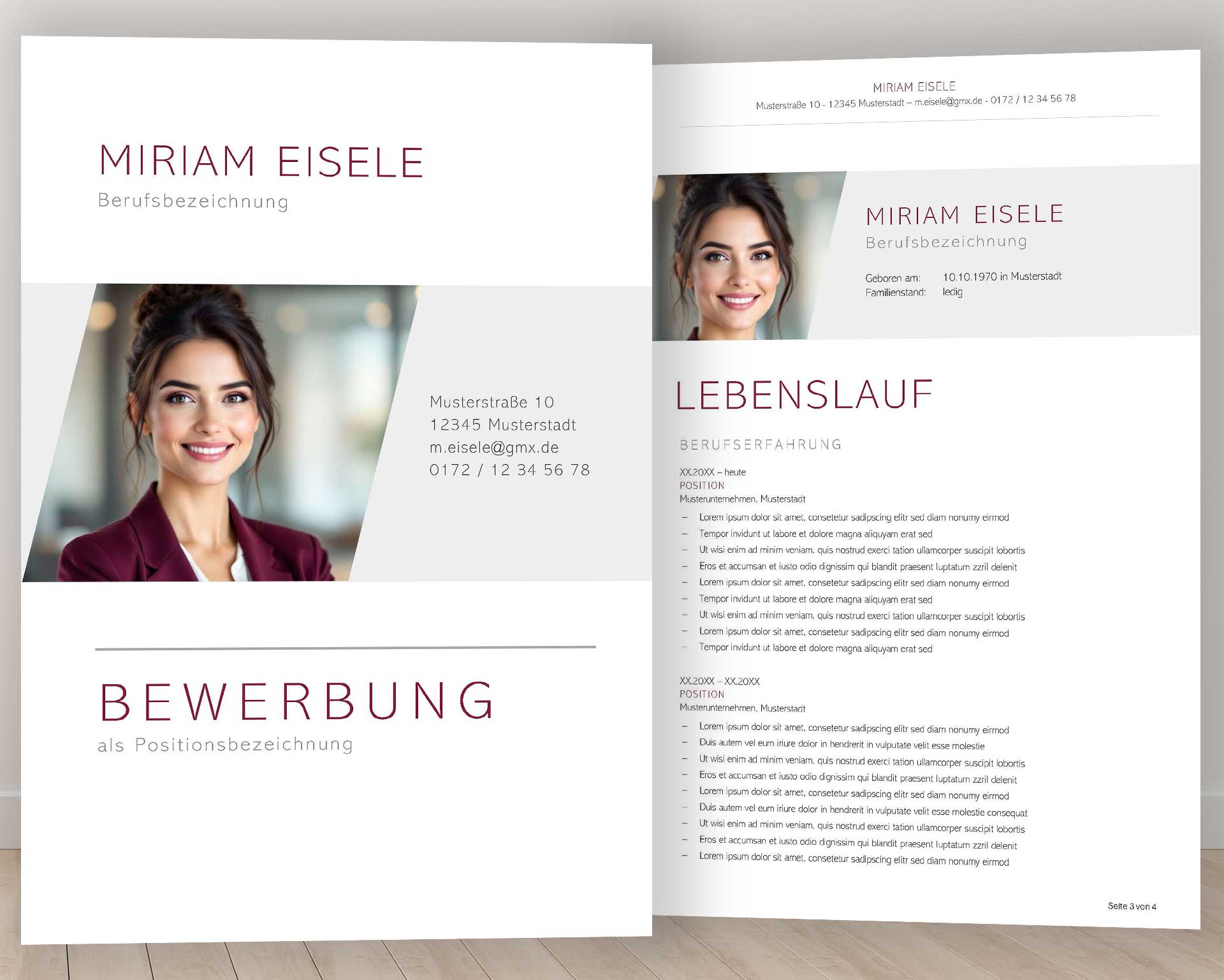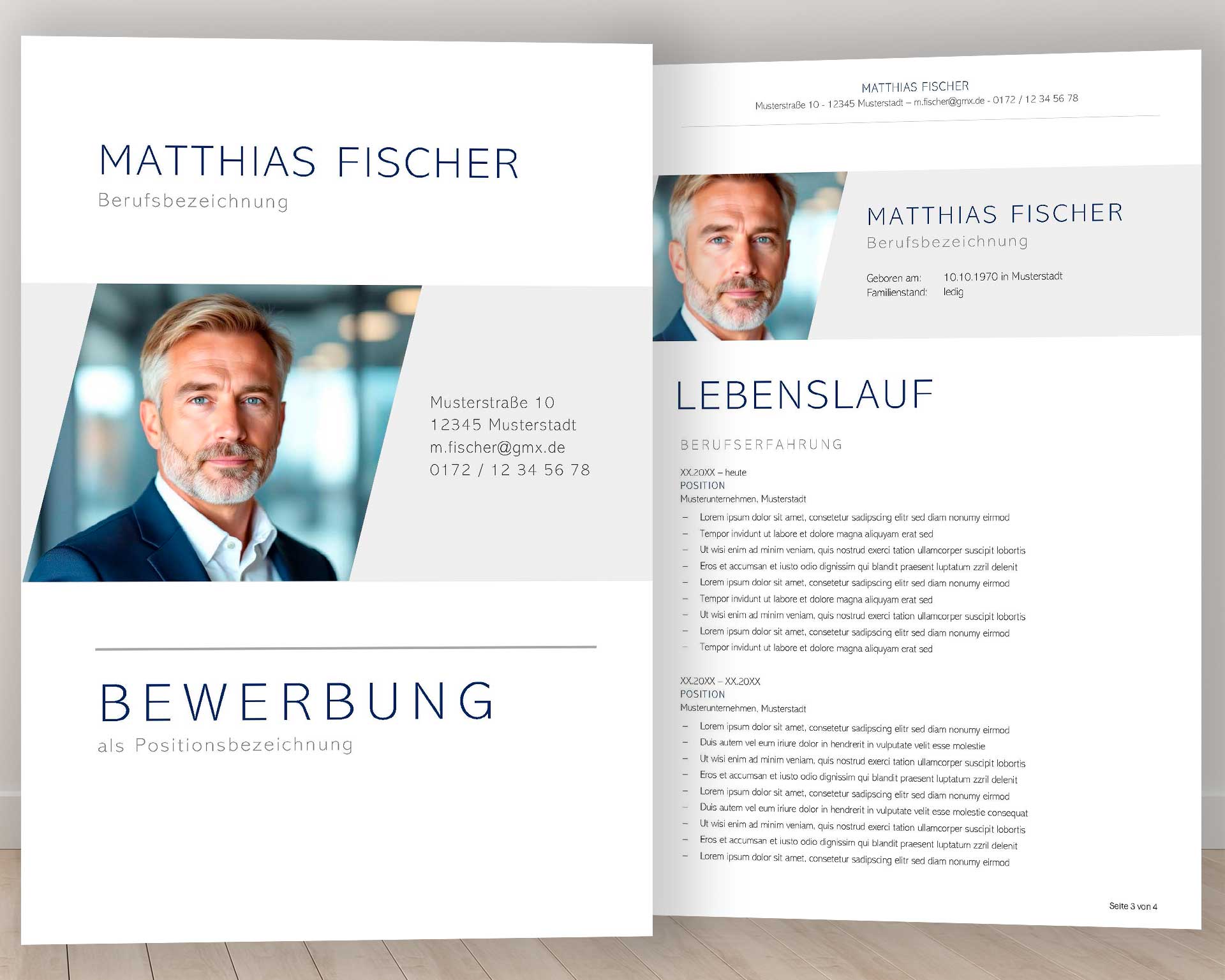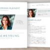 Schon beim ersten Hinsehen vermittelt das Design einen Hauch von Architektur: Die dynamische Diagonale zieht sich wie ein Lichtstrahl über das Deckblatt und rahmt dein Foto in einer Farbfläche, die an eine Bühne erinnert – bereit für deinen großen Auftritt. Das Seitenlayout wirkt wie ein Panorama-Fenster: viel Weißraum, klare Linien und dezente Akzente lenken den Fokus voll auf dich und deine Qualitäten.
