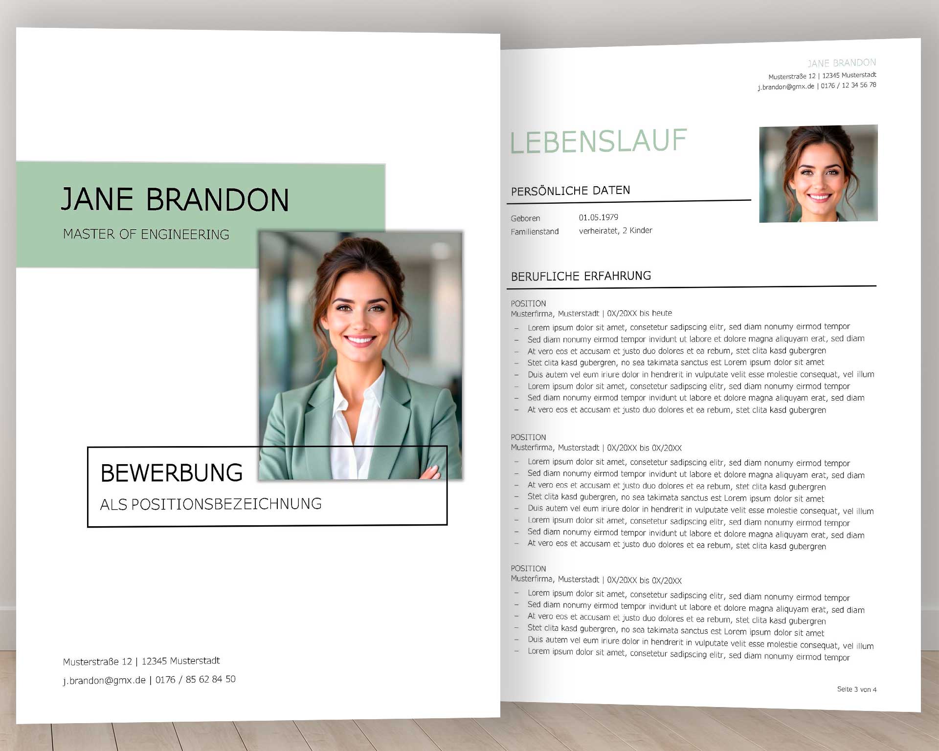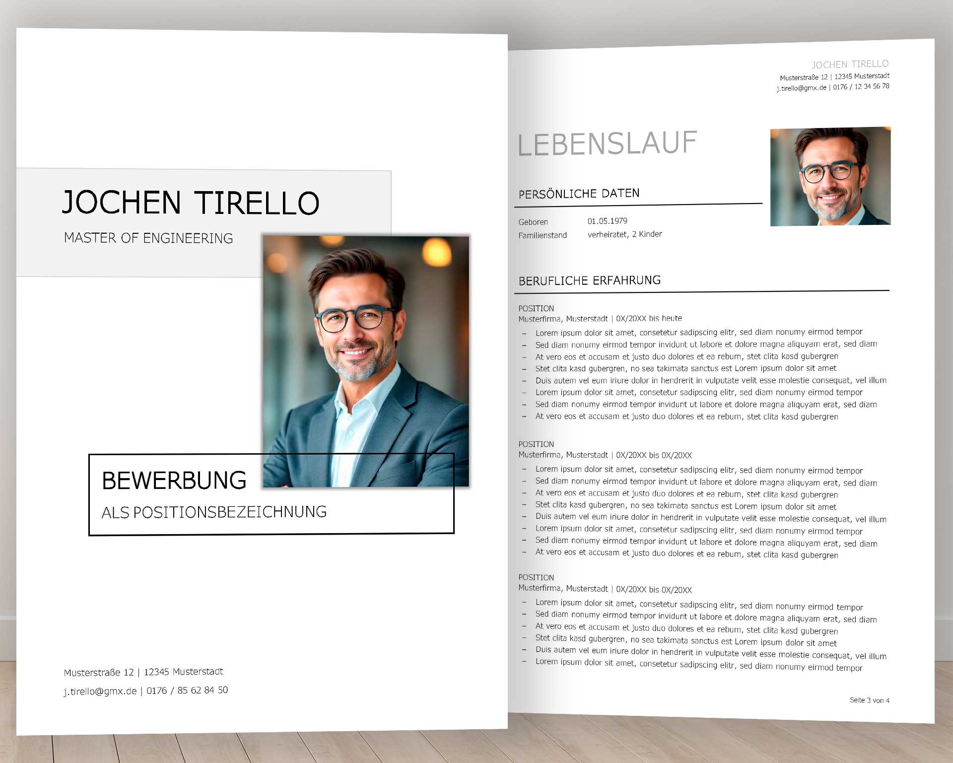 Die auffällige Kopfzeile in Blockoptik gibt deinem Namen sofort Präsenz und schafft einen starken, ruhigen Rahmen. Das Bewerbungsfoto sitzt bewusst gesetzt im Mittelpunkt und wird von einem fein gezeichneten Rahmen gefasst – wie ein Bild, das auf eine Galerieeröffnung wartet. Ein weiteres Detail ist das großzügige, helle Flächenlayout: Viel Weißraum sorgt dafür, dass jede Information für sich wirken kann und der Blick sich ganz natürlich lenkt. Die feine Linienführung und klaren Farbflächen geben der gesamten Bewerbung eine aufgeräumte, fast architektonische Anmutung, die Kompetenz und Zielorientierung ausstrahlt – ohne kühl oder distanziert zu wirken.
