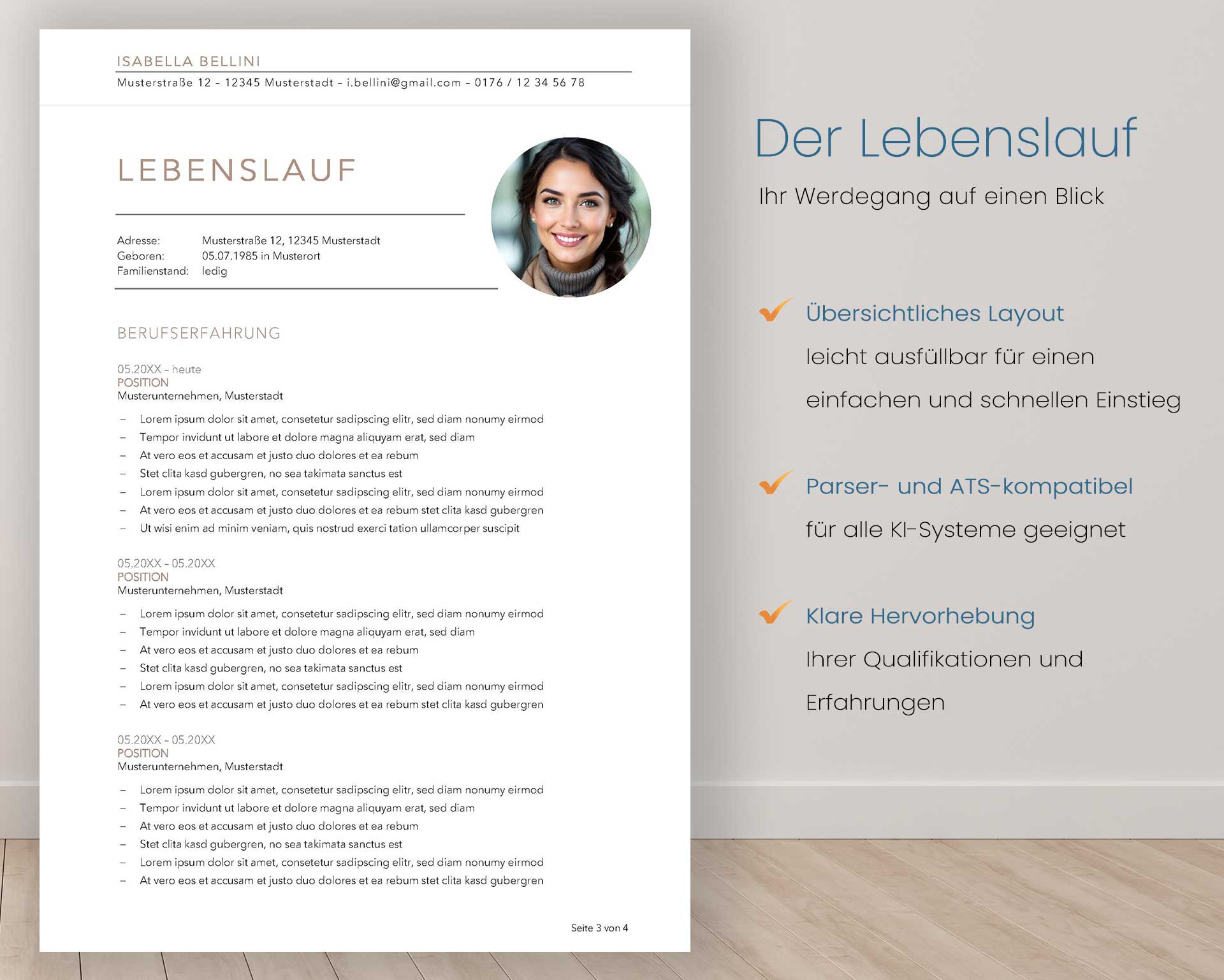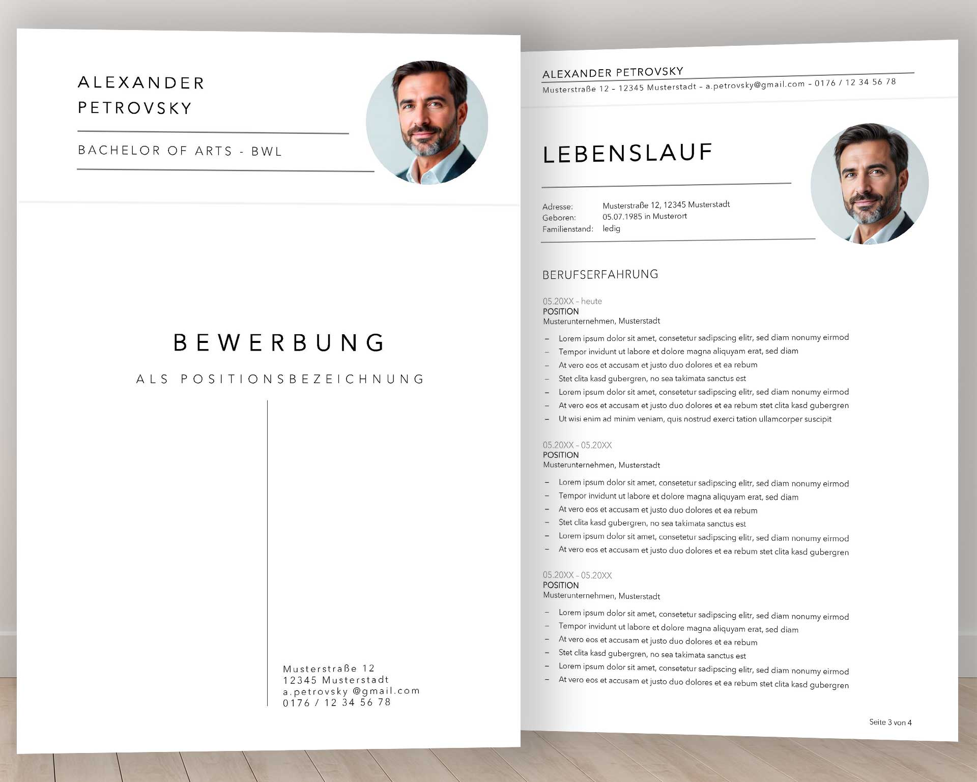 Dieses Design schafft sofort eine positive Verbindung: Der obere Bereich ist klar gegliedert, dein Bewerbungsfoto ist dezent kreisförmig eingerahmt und strahlt Offenheit aus. Die Kombination aus viel Weißraum und einer eleganten, feinen Linie führt das Auge direkt zu den wichtigsten Informationen, ohne abzulenken oder zu überladen.